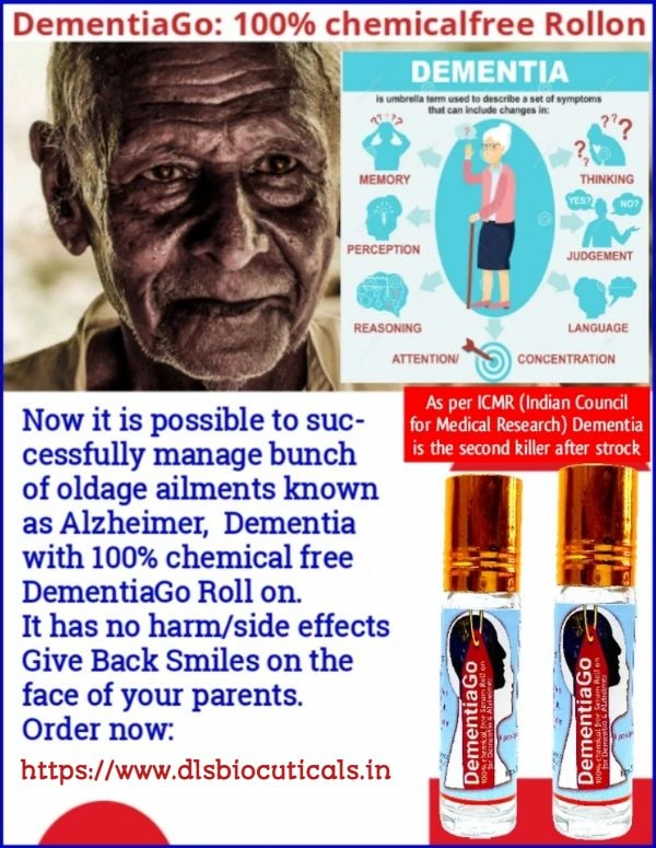 We have developed a 100% chemical free proprietory serum Roll on for the successful management of Alzheimer's, Dementia. DementiaGo Roll on is curated handcrafted vegan Roll on having no side effects, habit forming. It is safe for every one. It gives you relief in Alzheimer's, Dementia.